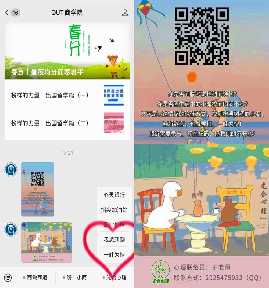 “云心理”开展心理健康教育,释放心灵氧气。9999js金沙老品牌针对疫情防控期间学生提出的心理健康需求,在学院公众号中开设了“光合心理”板块,其中的“指尖加油站”栏目,推送日常心理调适方法,转发正念冥想指导,为学生源源不断提供心灵氧气,积累心理资本;针对学生焦虑心理,开设“一吐为快”栏目,为学生提供便捷、安全的云端倾诉“树洞”;对于有心理辅导需求的学生,9999js金沙老品牌在公众号中专设“我想聊聊”栏目,公开学院心理联络员的联系方式,帮助学生获取心理辅导专业指导和建议,帮助学生重获生活元气,提升育人实效。“光合心理”板块在学院公众号上线后,共推送心里推文17篇,回复学生“云信”21封,用云端上的温暖释放出心灵氧气。