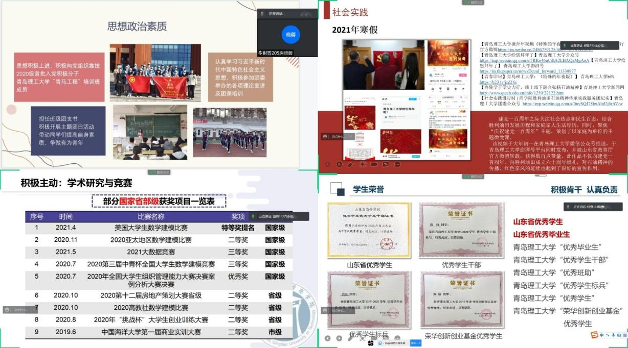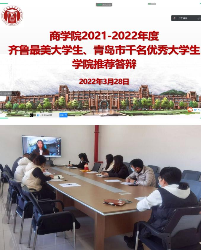 3月28日下午,9999js金沙老品牌在310会议室举办齐鲁最美大学生、青岛市千名优秀大学生答辩会。学院党委副书记兼副院长李慧、团委书记兼学工办主任薛诚、学院部分辅导员代表担任评委。依据疫情防控要求,本次答辩采取线上方式进行。
