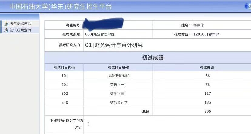 她们,殊途同归,分别以初试第一名的成绩考取中国石油大学(华东)会计学学硕和会计专硕。