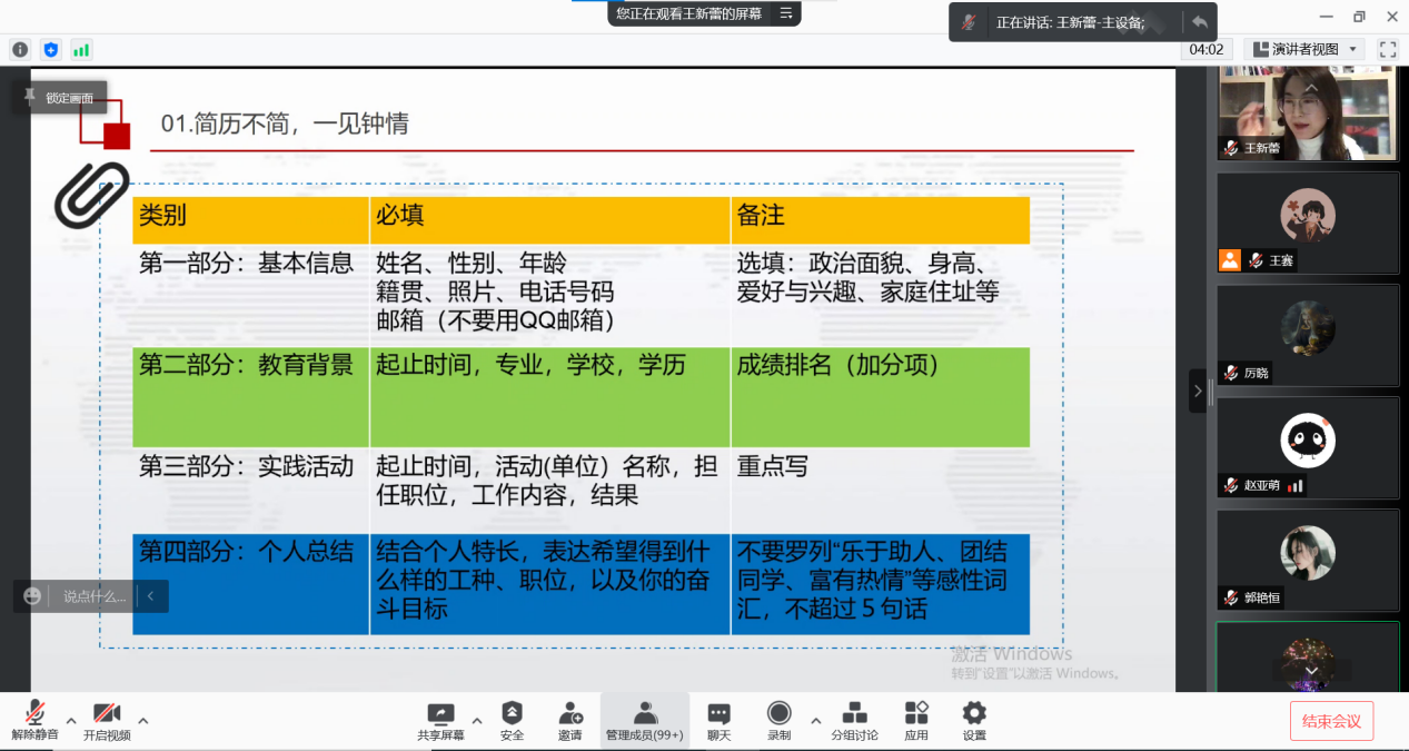 王新蕾从求职目标定位、求职准备、简历制作和面试指导等三个方面进行指导。指出简历的关键在于针对岗位要求呈现自己相应的能力素质,要从专业术语,工具、方法、流程,结果、数据等方面体现专业能力,通过教育背景、实践经历和技能证书等方面来证明自己能够胜任招聘岗位。在最后的线上提问环节中,王新蕾对毕业生目前遇到的就业问题进行一一解答。同学们纷纷表示,要保持积极的就业心态,客观分析自身的优势与不足,既要仰望星空,又要脚踏实地,让青春之花绽放在党和人民最需要的地方。
