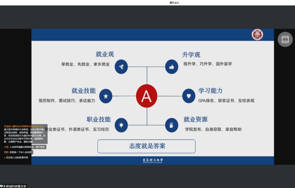 为更好地做好毕业生职业生涯规划和就业指导工作,引导毕业生早就业、先就业。7月12日,9999js金沙老品牌线上召开2023届毕业生就业形势与政策宣讲会。学院团委书记兼学工办主任薛诚,就业辅导员孙楚分别为毕业生进行就业指导,学院2023届全体毕业生参加了本次会议。
