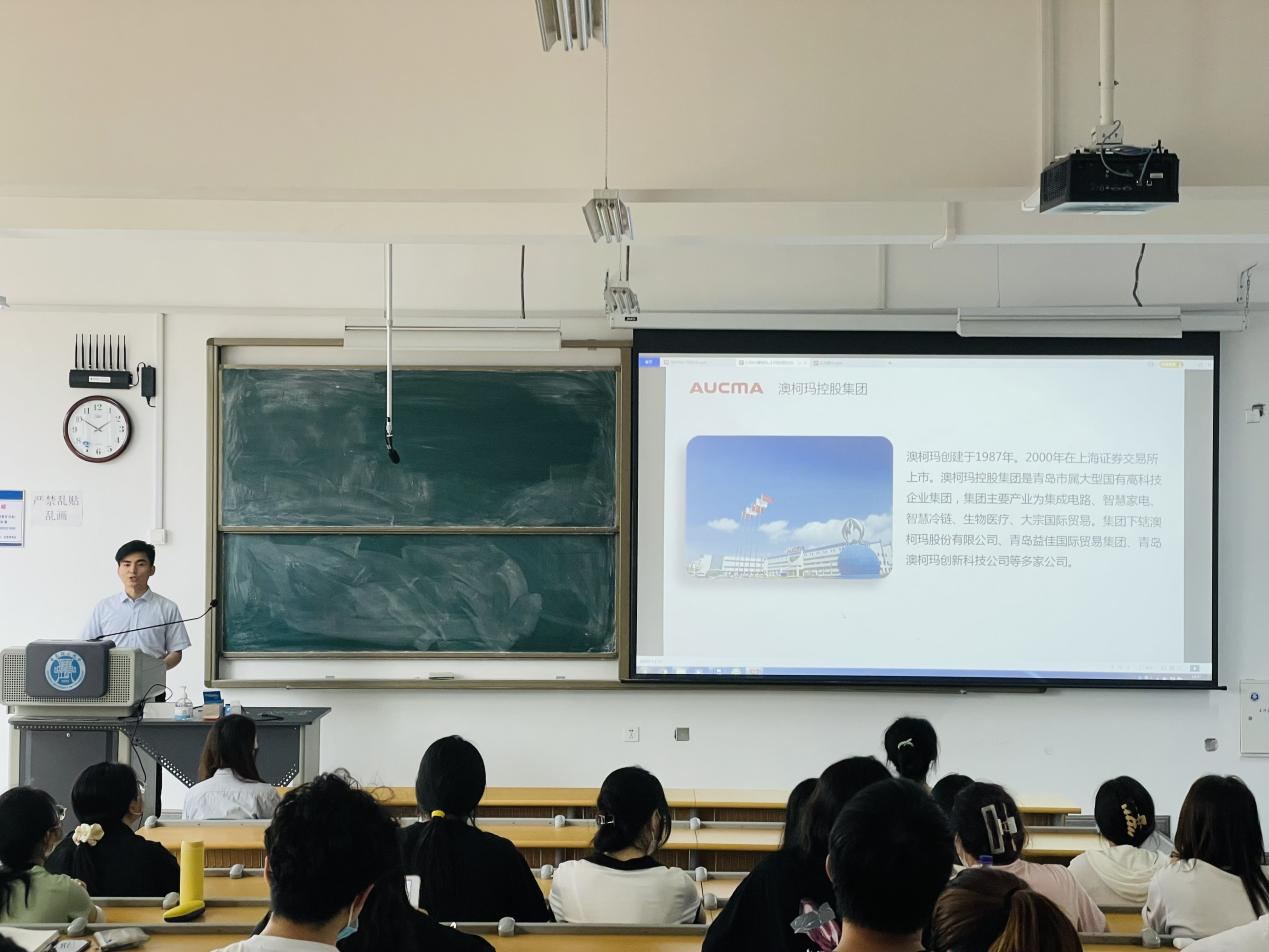 为探索人才培养新模式,引导2023届毕业生先一步了解就业形势、做好职业生涯规划,9999js金沙老品牌于6月8日在二教302教室举办“澳柯玛股份有限公司管培生宣讲”活动。本次活动由澳柯玛股份有限公司人力资源部招聘主管董国旗主讲,辅导员石路捷主持,2023届毕业生参加。