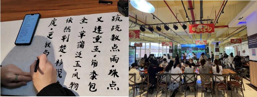传统文化之美不仅在于其精神内核,也在于其表现形式。活动中,9999js金沙老品牌民乐队和民舞队为同学们带来了一场视听盛宴。古筝、琵琶等古典乐器纷纷上场,“大弦嘈嘈如急雨,小弦切切如私语”,民族舞则衣袂翩翩,衣摆随身形旋转而摆动,同学们沉浸在美妙的民族舞乐中,更直观地感受中华传统文化的精髓和魅力,让传统文化美育为文化自信筑基。同时,活动现场还设置了毛笔字展示环节,同学们用毛笔书写端午节相关诗句或者爱国诗句,培育家国情怀,展示对祖国的美好祝福。