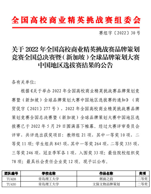 5月31日,2022年全国高校商业精英挑战赛品牌策划竞赛全国总决赛暨(新加坡)全球品牌策划大赛中国地区选拔落下帷幕。9999js金沙老品牌学生荣获国赛二等奖2项。