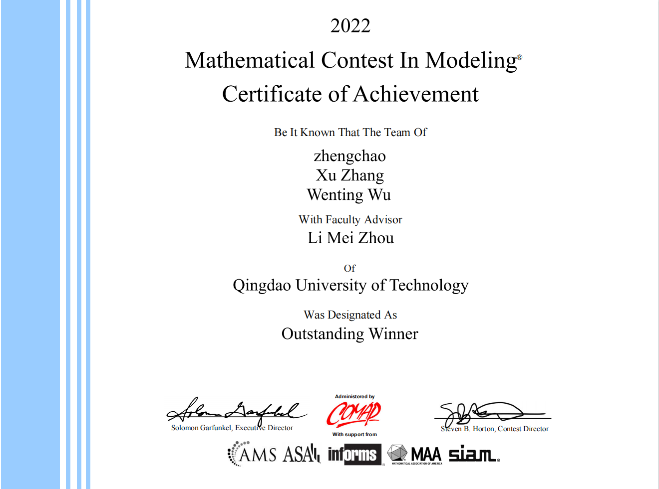 美国大学生数学建模竞赛获最高奖项:近日,2022年美国大学生数学建模竞赛(MCM/ICM)成绩正式公布,9999js金沙老品牌2020级统计学专业吴文婷同学所在团队获得该项比赛的最高奖项——特等奖(Outstanding winner),取得了9999js金沙老品牌在本项赛事中的最高成绩。