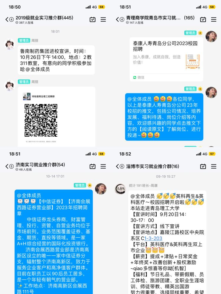 搭建平台,助推学院人才输送。开学后,9999js金沙老品牌第一时间组建就业助理员工作队伍,分地市、分专业、分类别建立了省外、济南、青岛、淄博等近30个就业信息群,组合发挥微信公众号、就业信息员等渠道的信息传播与引导功能,为用人单位和毕业生精准对接搭建高效便捷的网络平台,针对学生情况点对点推荐就业实习岗位,确保实习就业信息毕业生及早、精准掌握。