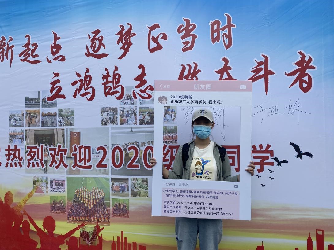 此时,一位财管专业的新生正举着商院的定制相框在迎新场地拍照。“我终于有了和青理的第一张合照!”早在“我和我的理工故事”活动中,统计203班王永钺就表示了他对青岛理工大学的向往,拍完照后,他第一时间将照片发给了父母,希望让他们能共同分享自己的喜悦。场地之外,新生们佩戴口罩有序地排队等候,虽然内心早已迫不及待,却都严格地遵守着疫情防控的要求。细微小事之中,充分体现了商院学子的自觉性和纪律性,老师也为同学们的防控安全意识感到欣慰。
