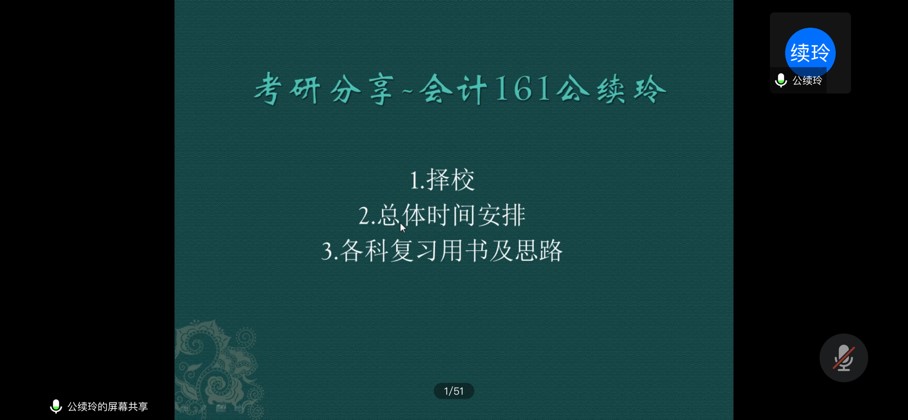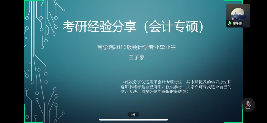 王子豪、公续铃分享了会计专硕的考研心得,按照时间顺序从计划制定、教材选择、目标选择、复试工作四个方面为同学提供了经验参考,鹿慧娇则勉励备考同学要调整心态、着眼当下、脚踏实地,与会同学纷纷表示受益匪浅,将吸取经验,从容备考。
