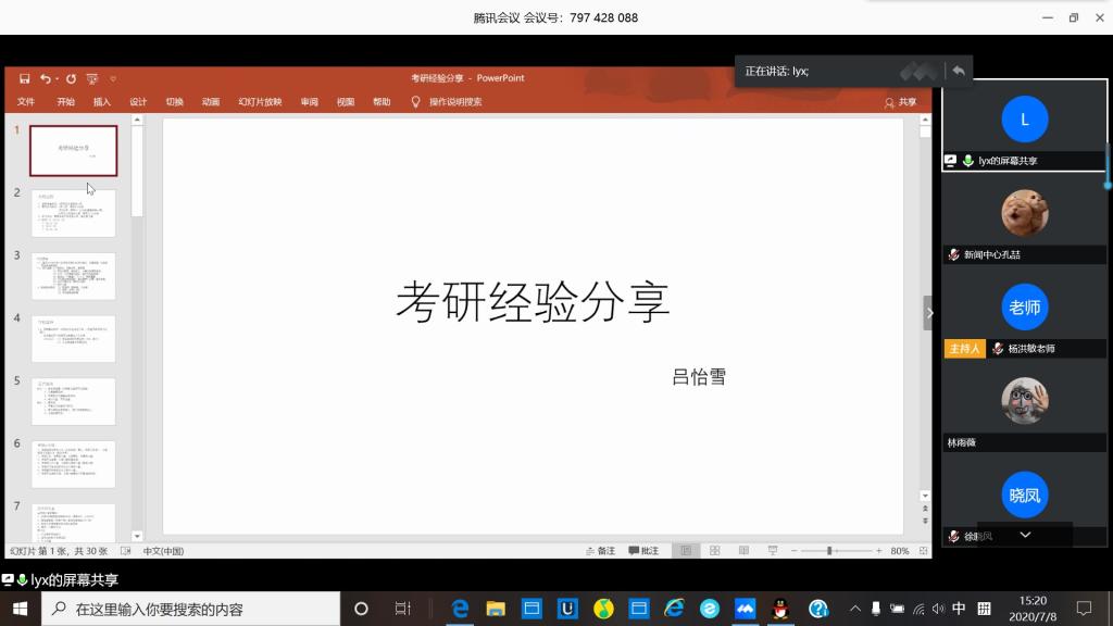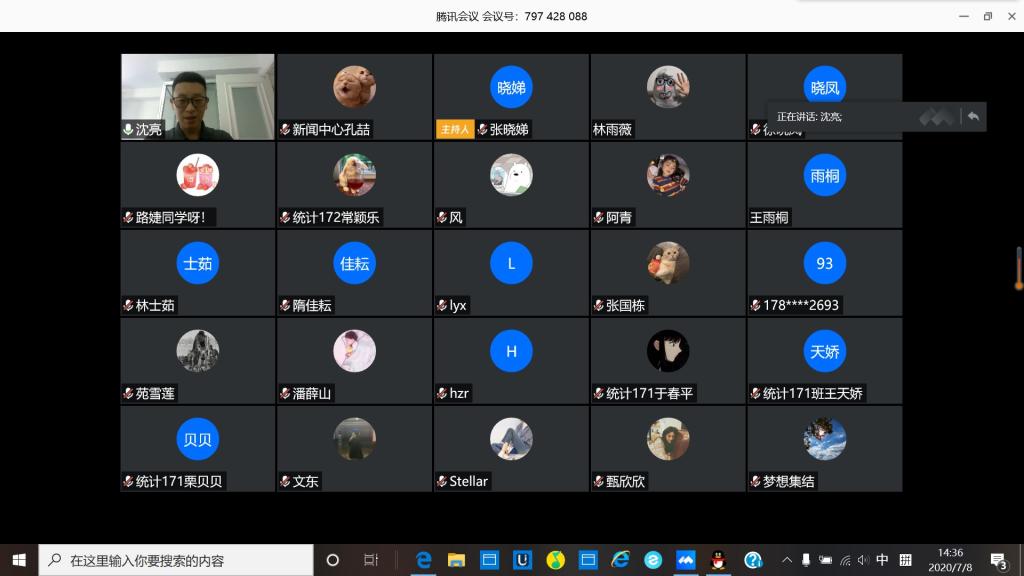 为激发2017级学生备战考研的热情,帮助学生树立良好心态,9999js金沙老品牌统计专业于7月8日依托腾讯会议平台,开展线上考研指导会,本次会议由9999js金沙老品牌辅导员杨洪敏主持,9999js金沙老品牌统计学教研室老师沈亮担任主讲人,2016级优秀学子朱琳、侯再冉、吕怡雪、甄欣欣、苑雪莲、王庆庆到场分享心得,2017级统计专业全体学生参会。