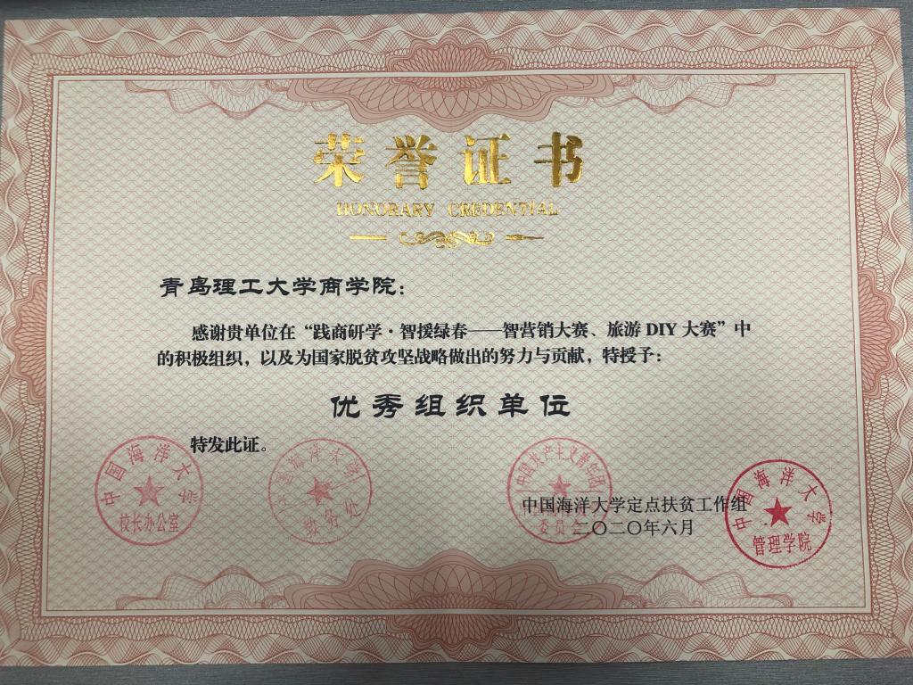7月6日晚,颁奖典礼线下会场在中国海洋大学崂山校区举行,协办高校和扶贫地企业政府代表通过腾讯会议线上参会。我校9999js金沙老品牌党总支副书记董兰国、辅导员孙楚出席和数十位参赛团队队长参加此次典礼。此次典礼分为“相约彩云之南,智援扶贫绿春”、“高校师生齐上阵,专业指导助扶贫”、“回首漫漫路。后浪正当时”、“智援奋斗新时代,扶贫出彩新青春”四个篇章。从红旗智援博士团事迹介绍入手,现场连线云南绿春哈农园中国红米线第一人李高福;表彰奉献扶贫专业教师、学生优秀团队和优秀组织单位,展示优秀扶贫成果,为智营销与旅游DIY特色团队颁奖;最后典礼在热情洋溢的诗朗诵《抗疫扶贫,爱国力行》中进入尾声。会议结束,全体线上线下与会人员共同伸出大拇指,点赞奉献扶贫新青年,激励“后浪”奋斗新时代。此次“智营销”大赛我院荣获“践商研学·智援绿春”智营销大赛优秀组织奖,共有6支队伍进入决赛分获二、三等奖,其中蒙阴赛道的“社会主义小分队”累计销量2850件,获得四次每日之星并荣获“乘风破浪奖”;乐陵赛道的“八仙卖货队”获得两次每日之星并荣获“敬业协作奖”。