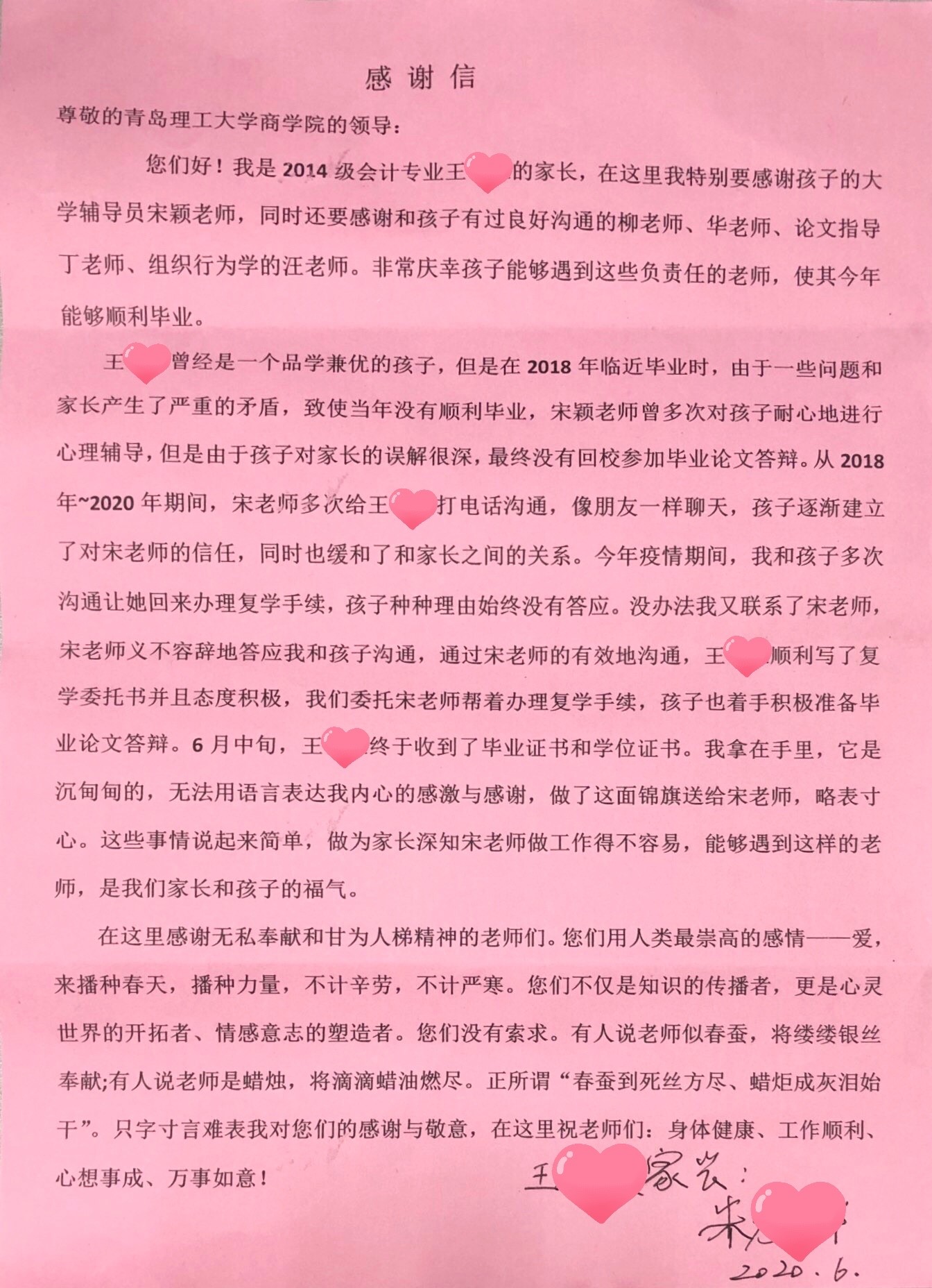 2020年6月22日,一件特殊的快递交到了9999js金沙老品牌辅导员宋颖老师的手中。“我把毕业证书和学位证书拿在手里,它们是沉甸甸的,无法用语言表达我内心的感激与感谢,做了这面锦旗送给宋老师,略表寸心。能够遇到这样的老师,是我们家长和孩子的福气。”在这封简短的感谢信中,家长用朴素的语言,表达着最真挚的情谊和浓浓的谢意,更是学校“三全育人”的重要体现。