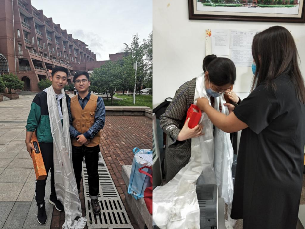 收到哈达的孙照又开心又激动。她说自己刚接手这届学生时,便对几位藏族同学的学习与生活一直关注有加,并通过学院少数民族学生结对帮扶活动对少数民族学生进行学习、生活上的帮扶。在和藏族学生相处的过程中,孙照为他们的每一点成长而倍感欣慰:“他们都非常懂礼貌,待人接物都非常谦逊,现在他们都顺利毕业奔向未来,我内心也很满足。我一直觉得哈达是一个很圣洁的物品,收到哈达内心感到荣幸与感激,希望他们保持优良的品质,奔赴远大的前程,早日实现梦想!”从孙照老师办公室出来后,四位藏族学生又分别找到了自己的班主任和授课老师,为他们送上了哈达、藏香等承载了深厚情谊的礼物。