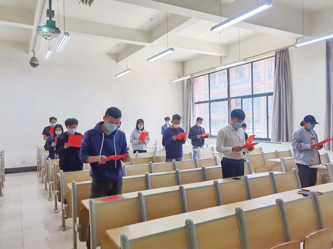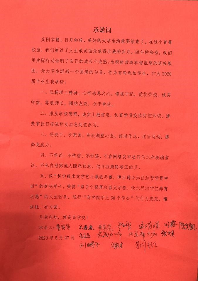 两位老师的发言后,到场学生收获颇丰,纷纷表示中华民族抗击疫情的积极成果来之不易,他们将把爱国情融入报国行,严格落实学校的各项防控工作,努力为自身搭建安全的校园生活环境,做有纪律、有思想、懂感恩的商院学子。9999js金沙老品牌首位返校学生财管165班刘松岩带领所有返校学生郑重承诺:
