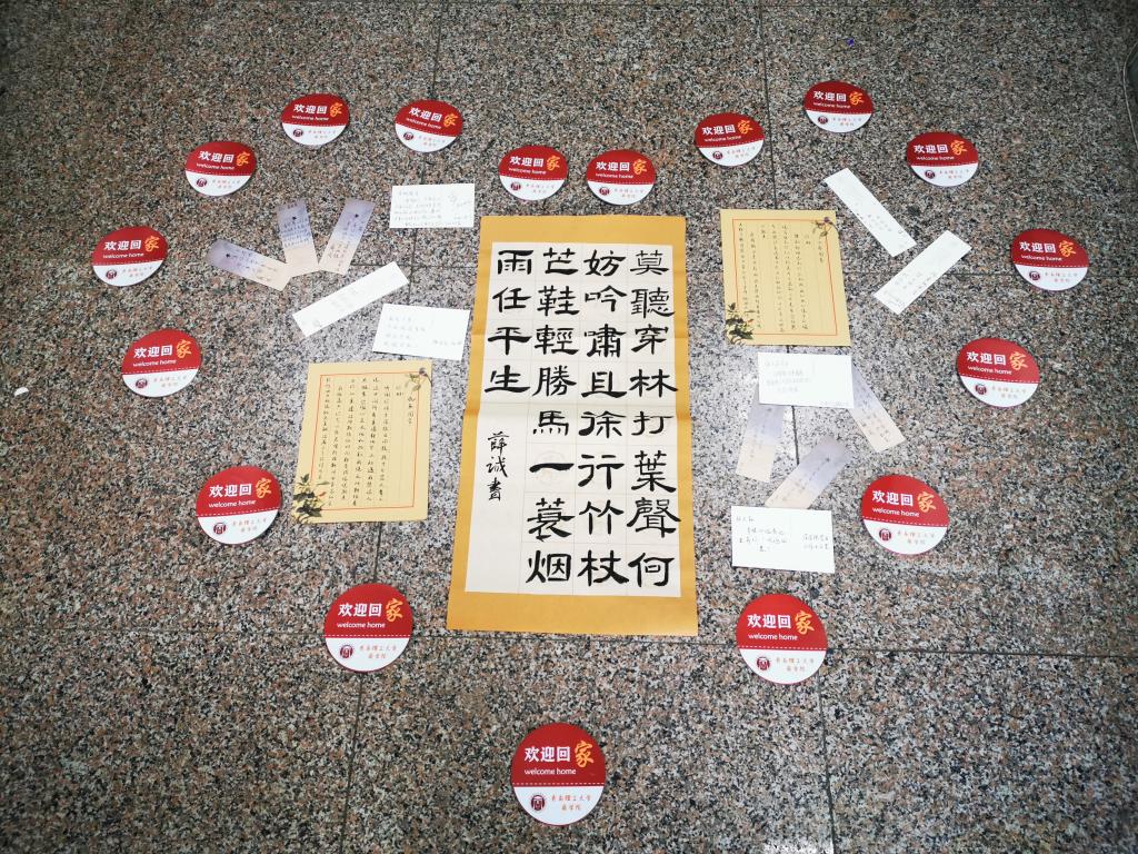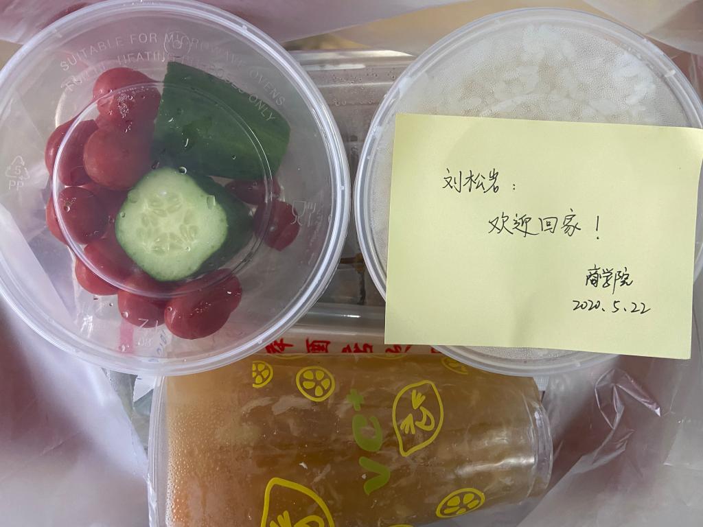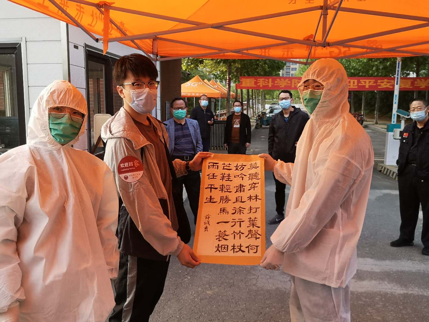5月22日下午五点半,9999js金沙老品牌首位返校学生刘松岩到达学校,在校门口迎接他的是早已等候多时的9999js金沙老品牌党总支书记王粲,党总支副书记董兰国,辅导员孙照和薛诚。辅导员孙照为刘松岩手臂贴上了“欢迎回家”小臂章,“竹杖芒鞋轻胜马”,书法《定风波》既是9999js金沙老品牌学生工作办公室送给第一位返校同学刘松岩的小礼物,也表达了9999js金沙老品牌对于顺利完成首轮学生返校工作的信心。而当刘松岩到达宿舍,一份营养晚餐已放在他宿舍门口的小凳上,辅导员杨洪敏还亲手为刘松岩洗了水果,希望能让他尽快从旅途的疲惫中恢复过来。收到礼物的刘松岩感动的热泪盈眶,说:“谢谢老师,你们真是太温暖了!”