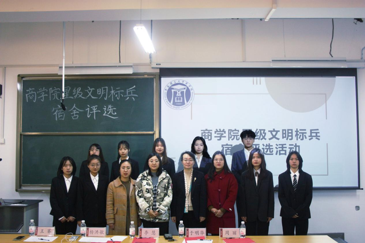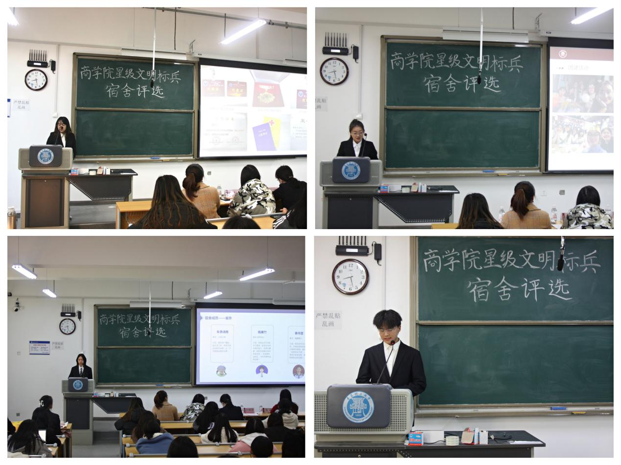 经过前期报名申请、学院初审,最终共有10个宿舍进入答辩环节。各宿舍代表依次进行答辩,从宿舍概况、学风建设、思想建设、综合素质、未来发展等方面进行介绍,展现了宿舍中温馨和谐、互助友爱的良好氛围。答辩现场,六人累计获得奖项和荣誉79项的“学霸宿舍”、校排球锦标赛与女子篮球赛均获冠军的“活力宿舍”等各具特色的宿舍层出不穷,引起现场阵阵惊叹和掌声。温馨宿舍的欢声笑语,迎难而上的铿锵口号,相约考研的铮铮誓言,展现出商院学子“乘风破浪会有时,直挂云帆济沧海”的精神面貌。经过评选,B4#804、B4#909宿舍获得星级文明标兵宿舍一等奖,B4#1014、B4#607、B3#505获得二等奖,D4#310、B3#211、B3#217、B4#510、B5#604获得三等奖。