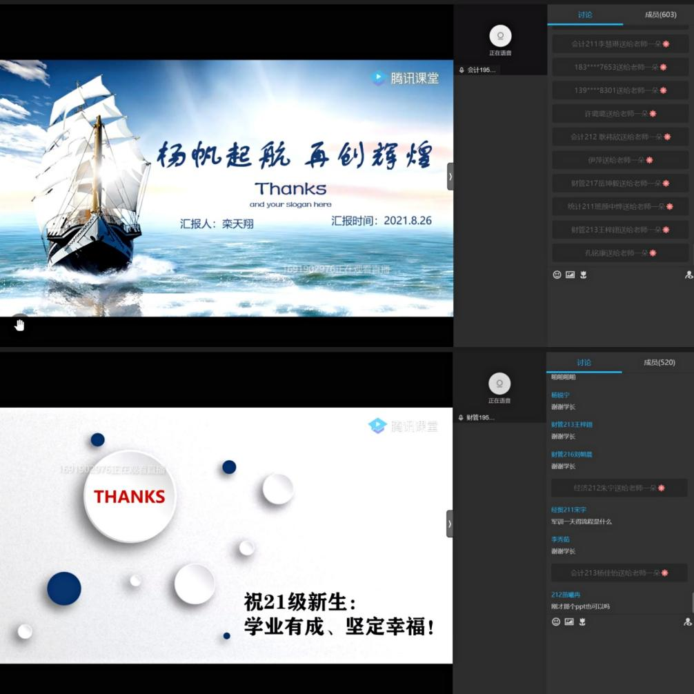 为帮助2021级新生明晰专业学科特色与学习方法,尽快适应大学学习与生活,进一步明确奋斗目标,9999js金沙老品牌于8月26日晚上7点30分依托腾讯课堂召开优秀学长经验分享会。本次活动由国商专业副总班助胡乃心主持,会计195班栾天翔、财管195班马天淇主讲,9999js金沙老品牌辅导员臧瑶瑶、于明华以及2021级全体新生参加。