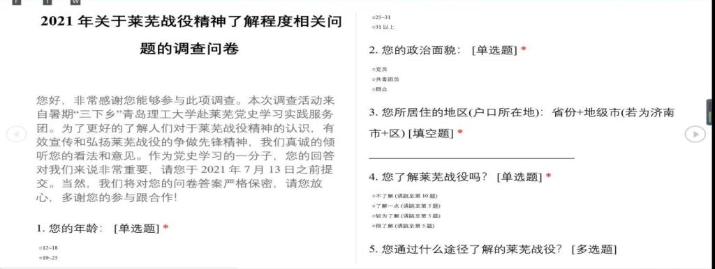 山东莱芜作为抗日战争时期鲁中地区根据地之一,有“红色热土、鲁中明珠”之称。为使广大青年同胞深入了解莱芜这片红色大地,在收集资料方面,团队以红色革命精神为主题,发放调查问卷开展调研,确保数据的准确性和实效性。同时,团队成员们积极引导广大青年学生传承发扬红色革命精神,为更好地推动莱芜地区城市文化建设、助力文旅产业发展贡献力量。