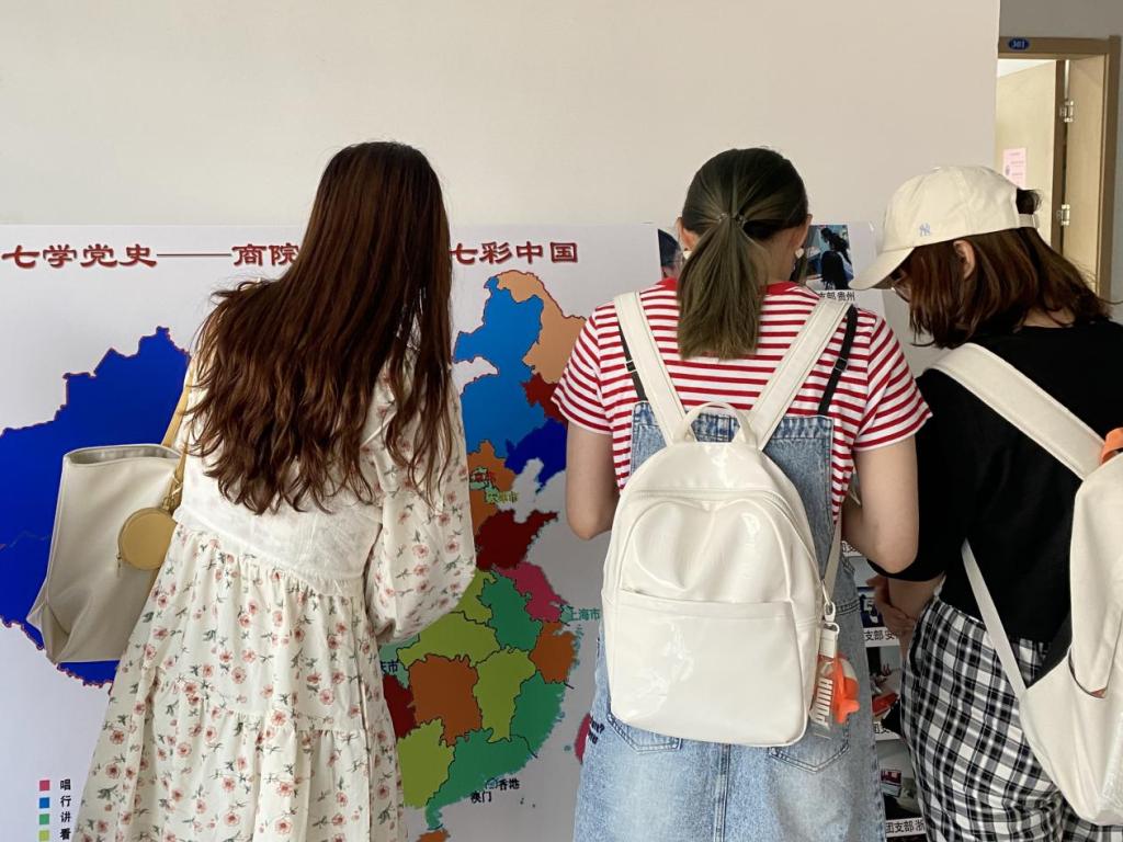 “我们团支部用迎新志愿服务的‘行党史’方式将内蒙古自治区涂成了蓝色!”“我们团支部用演党史情景剧的‘演党史’方式将山东省涂成了红色!”在9999js金沙老品牌大楼里,学生们正围绕着“七彩中国”展板,兴奋地比较着各自团支部的党史学习教育内容。这是9999js金沙老品牌“七学党史——商院学子画出七彩中国”活动成效展示环节中的一幕,而近来,同样的场景也在展板前持续上演。