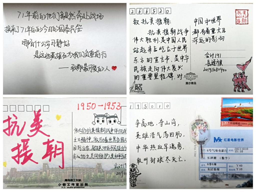 中国人民志愿军不惧强敌、敢于斗争的英雄气概以及英勇顽强、舍生忘死的战斗精神令人感佩。值此抗美援朝71周年纪念日之际,商院学子铭记历史、致敬“最可爱的人”。会计202张梦词在明信片上写下了这样一段话:“71年前他们毅然奔赴战场,换来71年后国泰民安、山河无恙。哪有什么岁月静好,是无数英雄在为我们负重前行。”会计191克淼绘制精美手抄报,图文并茂宣传邱少云、尹玉龙的英雄事迹,以图重现抗美援朝历史情境,以文表达对先烈的无限崇敬。统计212杜兰兰选择以中国红为主基调制作电子海报,一笔一画勾勒英雄血肉,正是他们用一枪一炮换来了这当今的盛世和平。她表示,作为一名新时代青年,应当传承红色基因,赓续红色精神,勇担民族复兴之重任,不负党和人民的殷切期望。会计193王红梅表示获益匪浅:“人民志愿军经历两年零九个月艰苦卓绝的浴血奋战,卓越地完成了祖国和人民赋予的光荣使命,用青春、热血和生命锻造出伟大的抗美援朝精神。在世界面临百年未有之变局的今天,这份精神激励着无数后来者不负时代、不负韶华,用责任和担当诠释中华民族的荣光。请党放心,强国有我!”