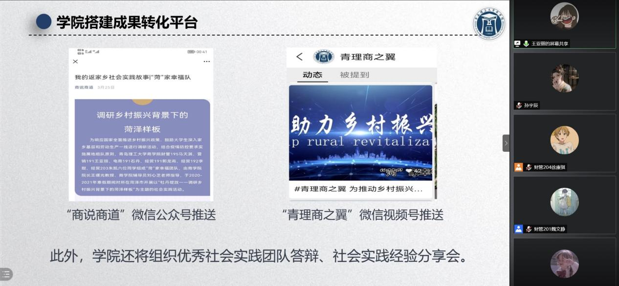 随后,历年优秀社会实践学生进行经验传授分享。营销191班王亚丽结合“牡丹绽放——调研乡村振兴背景下的菏泽样板”社会实践案例,对实践项目的选题和设计进行详细讲解,深入浅出地为学生们解答如何将社会实践成果进行转化的问题。电商191班石丹重点阐述调研报告撰写格式及调研方法,为同学们进一步完善社会实践报告提供了帮助。经贸191班李若林介绍了学院新闻宣传方面的投稿要求,提示同学们投稿的稿件质量、文章结构、照片要求、视频发布等方面的注意事项。