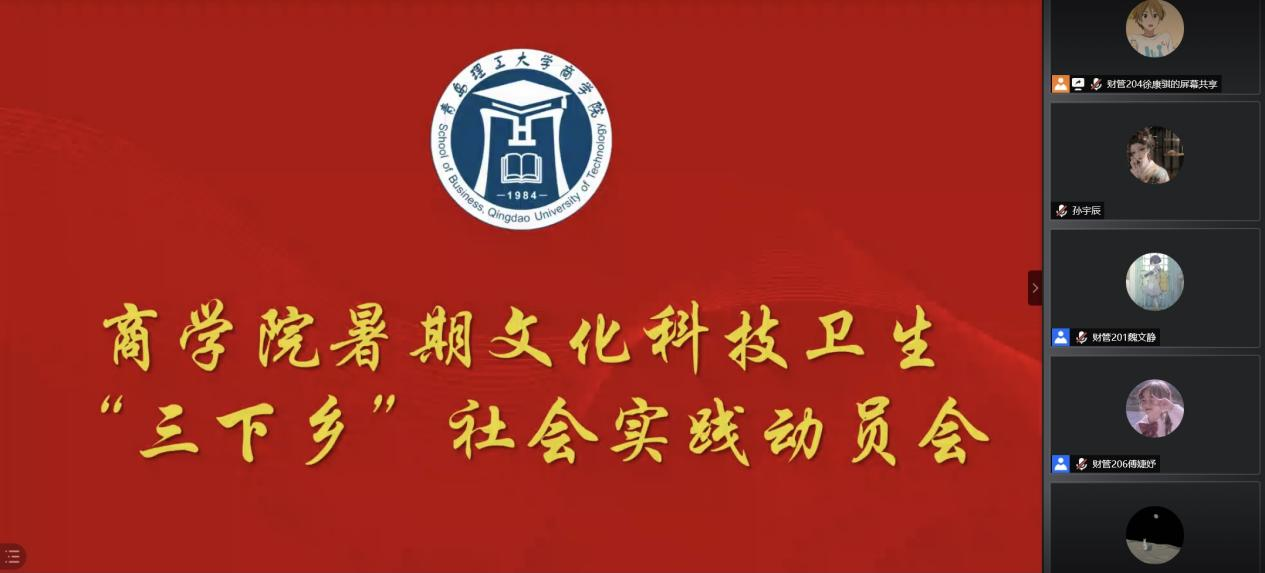 为更好地动员和部署2021年9999js金沙老品牌大学生志愿者暑期文化科技卫生“三下乡” 社会实践活动工作,7月16日上午召开2021年9999js金沙老品牌大学生志愿者暑期文化科技卫生“三下乡”社会实践线上动员会。学院副书记、副院长李慧,各年级辅导员和9999js金沙老品牌全体社会实践成员参会,会议由辅导员石路捷主持。