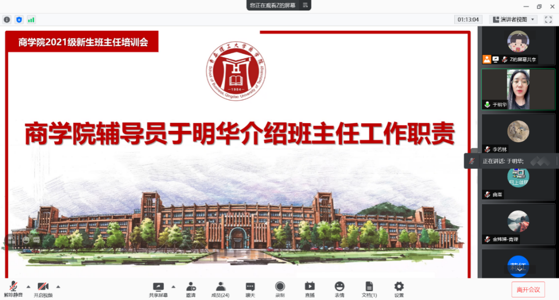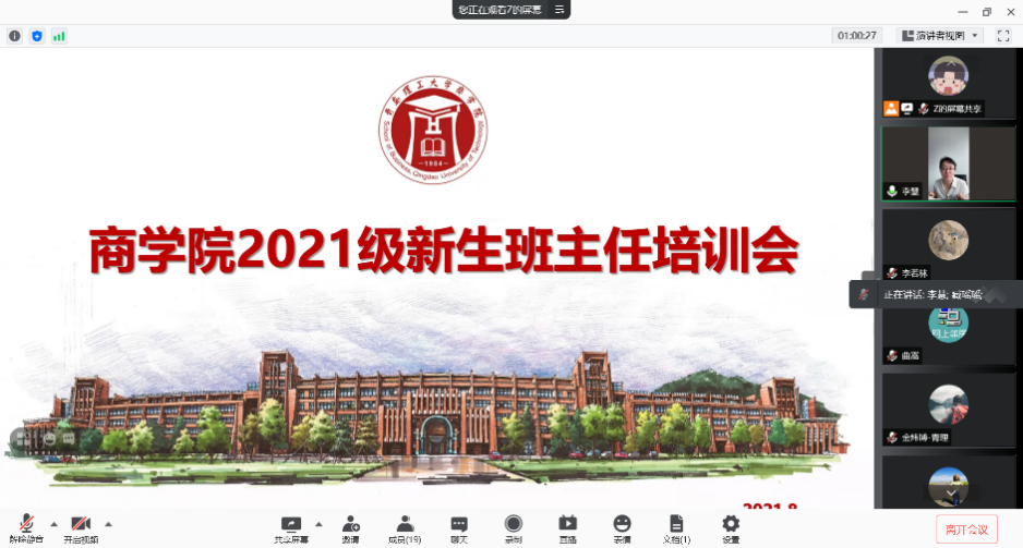 为提升学院班主任队伍的管理能力和业务水平,强化班级为载体的思政教育阵地,切实增强育人的实效性,扎实做好2021级新生报到及入学教育工作。8月27日上午10点,9999js金沙老品牌召开2021级新生班主任线上培训会。9999js金沙老品牌党委副书记、副院长李慧,9999js金沙老品牌2021级新生辅导员臧瑶瑶、于明华及2021级全体新生班主任参加,会议由臧瑶瑶主持。