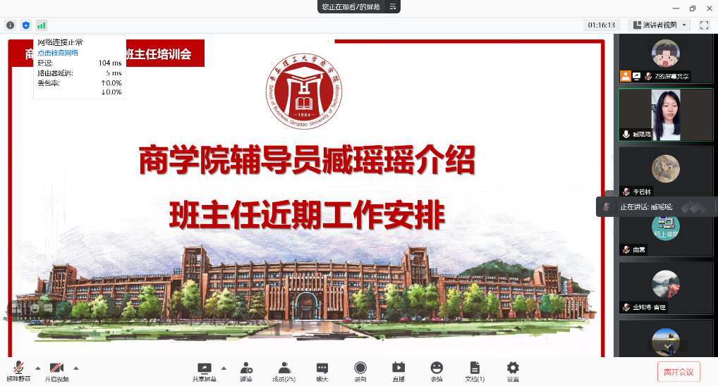 最后,臧瑶瑶从新生管理、宿舍分配情况、疫情防控、网上报到、学生活动等方面汇报了前期工作进展,并对迎新工作进行了详细阐述。一是做好新生入校的疫情防控准备工作,全面掌握防控要求,进一步熟悉疫情防控处置流程和规范操作。二是做好联系新生工作,组织开展新生“线上见面会”,做好班级分析、学生分析,为班级管理打下良好基础。