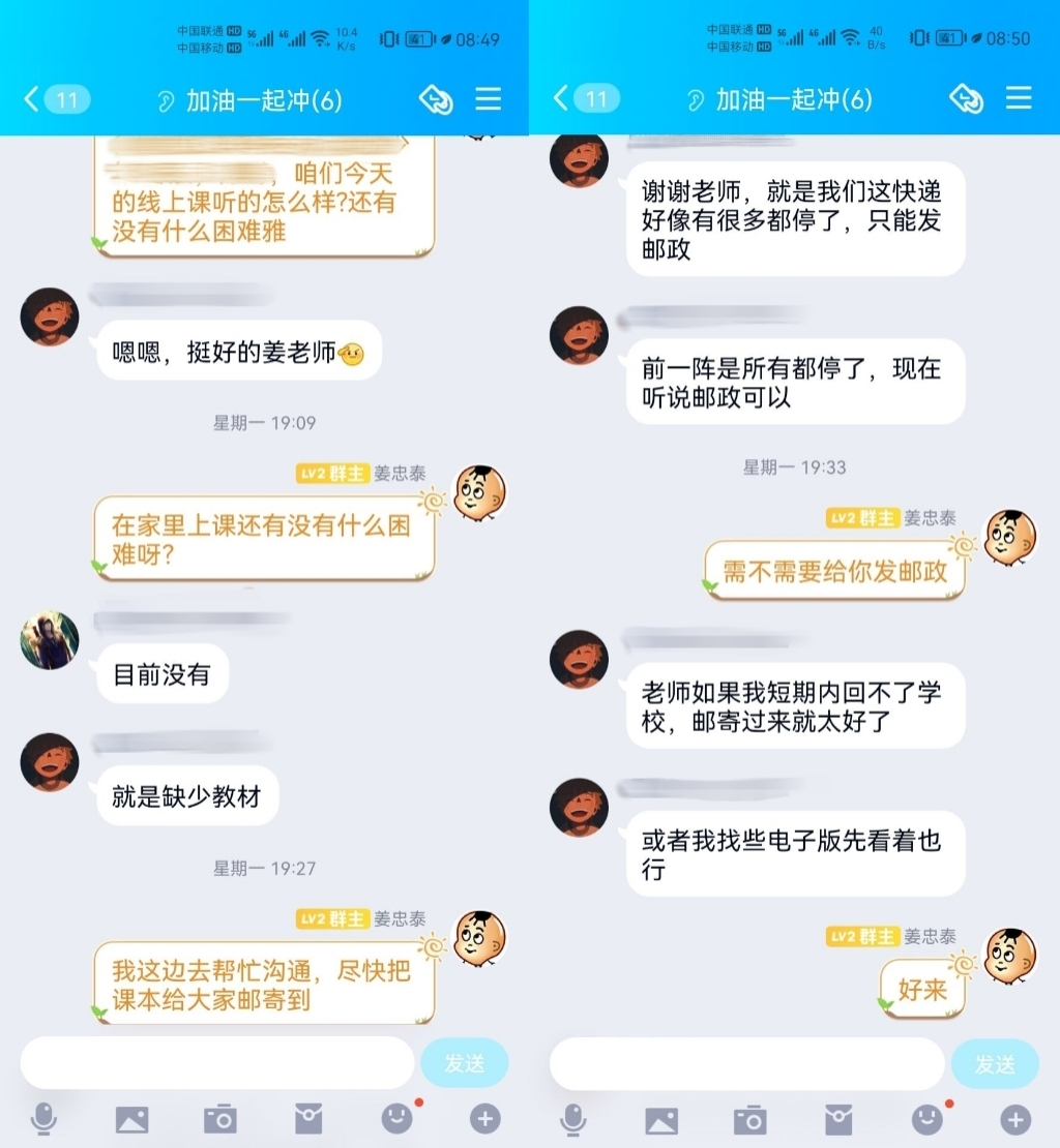 辅导员时刻关注学生需求,实时解决学生学业困难:携手共同进步,是目标更是责任。为了更好了解未返校同学的动态,9999js金沙老品牌辅导员和未返校同学建起了QQ群,并命名为“加油一起冲”,辅导员们每天和未返校同学沟通现实需求:“咱们今天的线上课听得怎么样,有没有什么困难?”“课听得很好,就是缺少教材。”“我去帮大家沟通一下,尽快把课本给大家邮寄过去。”这样的对话跳动在屏幕上,温暖着同学们的心。当了解到同学们在家没有教材后,9999js金沙老品牌老师以最快速度将教材用快递邮寄至同学们手中。财管203班李同学信心满满地说道:“9999js金沙老品牌的老师对我们非常关心,给予了我们很大的帮助,我们在与老师的沟通中我们也体会到了老师工作的辛苦,我们定不会辜负老师的期望,不辜负老师对我们的付出,居家期间认真学习,一个人都不会掉队,一门课程都不会落下!”
