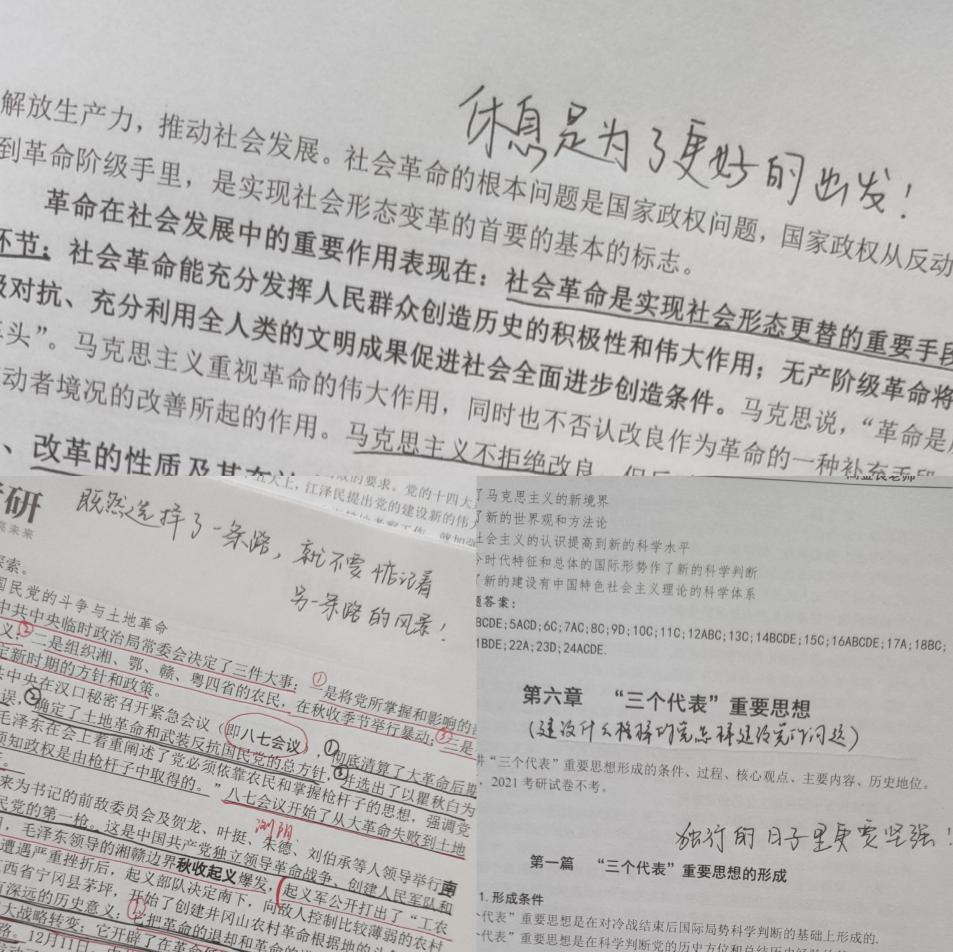 在考研笔记中,还有着脑洞大开的“图画”式笔记,在经贸172班刘明昊同学的笔记本上,用一副漫画组图画出了中国共产党的百年发展历程,妙趣横生、一眼难忘。而如今,成功考入山东科技大学的他将自己的考研笔记送给了经济182李希同,他说:“考研的日子虽然辛苦,但祝愿你能从中感受到学习的快乐和收获的喜悦。”