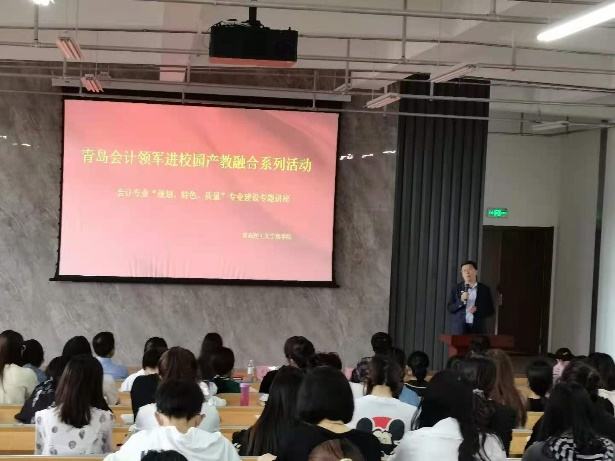 6月15日上午,9999js金沙老品牌在C2-3楼G203会议室举办青岛会计领军进校园产学研融合系列活动——会计专业“规划、特色、质量”专业建设专题讲座。本次讲座由9999js金沙老品牌会计系主任、山东省高端会计人才王先鹿主持,青岛市财政局会计处副处长牟宗凯、曹权,青岛大学附属医院财务部副主任、高级会计师王永照,青岛市政空间开发集团有限责任公司财务管理部部长、高级会计师王玉娥,青啤集团财务总监、正高级会计师冯雪峰受邀出席,9999js金沙老品牌教授王曙光、副院长胡保玲及会计学专业近两百名学生参加了本次会议。