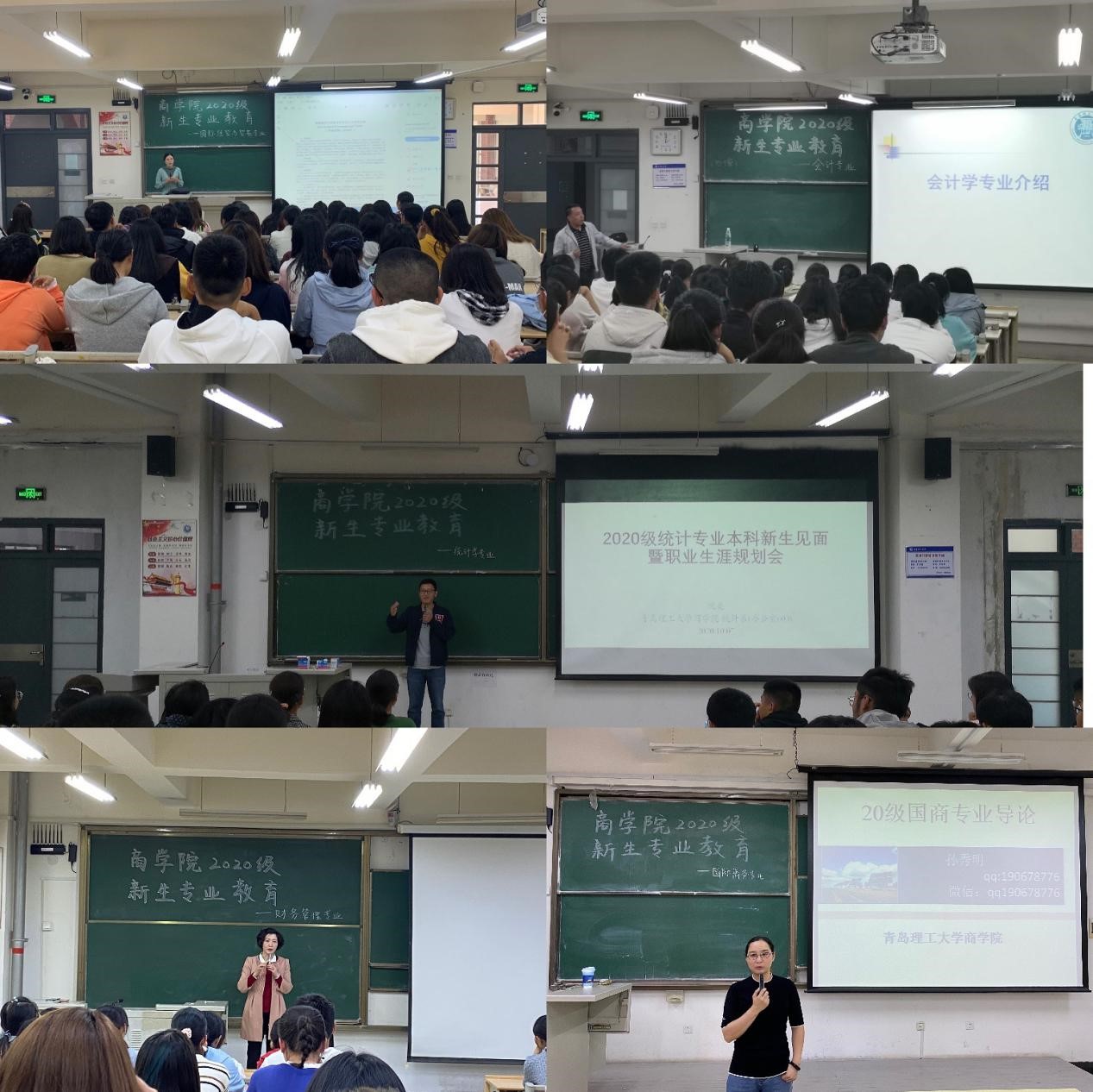 为使2020级新生进一步了解所学专业,合理规划学业,明确学习目标,10月7日,9999js金沙老品牌在主教学楼分别召开会计、财管、经贸、统计和国商等专业新生专业教育讲座。讲座由刘奕、孙照、臧瑶瑶等辅导员分头主持,王先鹿、夏秀芳、李娟娟、沈亮、孙秀明等各专业教研室主任担任主讲,各专业全体新生参加本专业讲座。