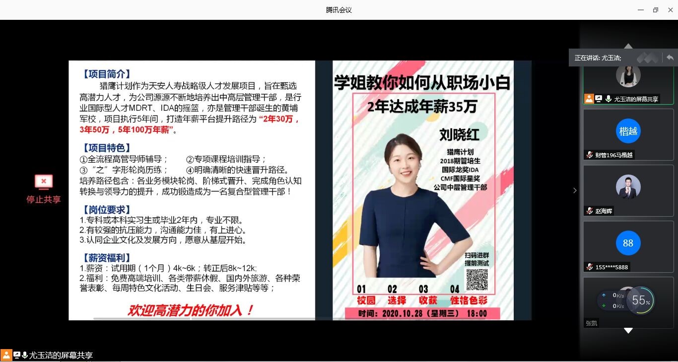 为更好地拓宽2021届毕业生就业渠道,9999js金沙老品牌于10月28日晚通过腾讯会议召开天安人寿2021年校园招聘宣讲会。此次宣讲会由性格色彩分析师尤玉洁、2018期管培生刘晓红担任主讲,9999js金沙老品牌2017级毕业生参会。