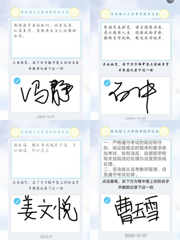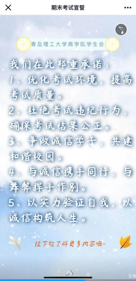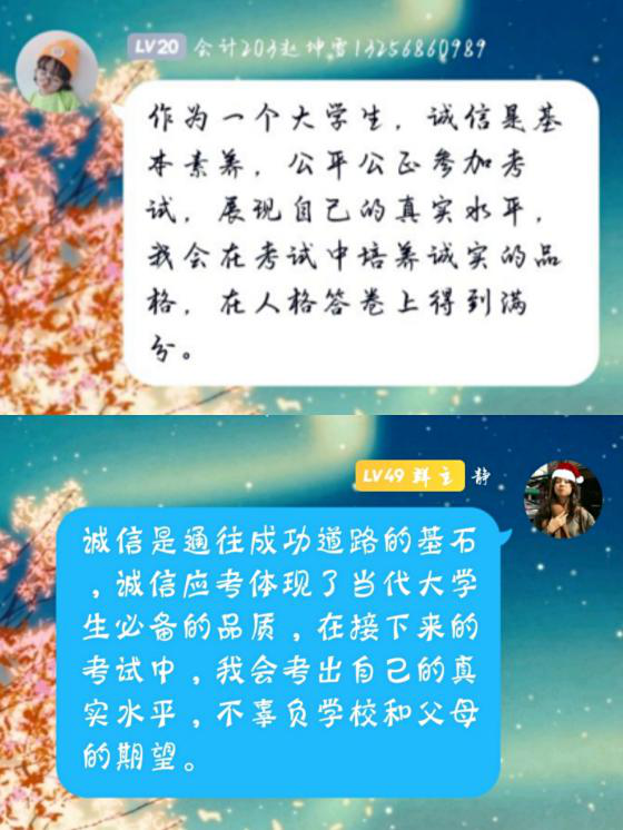 诚信是中华民族的传统美德,是个人立身安民之本,诚信应考更是衡量学生个人综合素质的重要尺度,是践行社会主义核心价值观的基本要求。本次活动由9999js金沙老品牌学生会学术发展中心发起,采用线上的方式,以各团支部为单位广泛组织,此举有助于同学们积极备战各类考试,督促9999js金沙老品牌学子通过自己的不懈努力在考试中再获佳绩。“争做诚信学子,共建和谐校园;与诚信携手同行,与舞弊挥手作别;以实力验证自我,以诚信构筑人生。”一句句铮铮誓言彰显着同学们诚信考试的决心。
