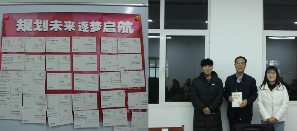 王先鹿从专业成绩、学风指标、各类奖项、学术活动、荣誉称号等方面对班级学年综合成绩进行分析和汇报,肯定了班级在过去一年取得的成绩,指出了短板与不足,提出了接下来的班级发展目标。学习优秀学生王佳佳和杨淑钰做学习经验分享交流,引导班级同学掌握科学的学习方法,坚定信念、确立目标,为实现个人理想不懈奋斗。同学们以“规划未来,逐梦启航”为主题,同学们依次上台交流个人未来发展目标,将承载心愿的卡片贴在海报上。班级同学们自制成长记录册赠送给齐德义,汇报每个人一年来的成长及未来规划。