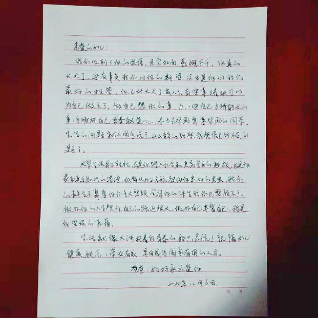 “ 爸,妈:见字如面!看到女儿的一封信,我想你们一定是极为惊讶的。感谢你们18年的养育,感激你们教会我成长,也感恩你们付出的辛劳、眼泪和温暖……”为响应传承红色基因、品读红色家书的时代号召,使广大学生深切感受到家书背后炽热的家国情怀,12月10日,9999js金沙老品牌在北区三号公寓一楼开展了“感由‘信’发,恩从心涌”——“一封家书寄真情”优秀作品展览活动。
