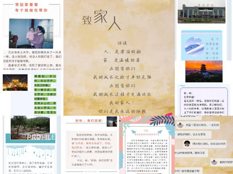 人各有所长,情却同样深厚,为发挥更多同学的长处,本次家书活动增添了新花样,参与形式丰富多彩,参赛同学通过书信、手抄报这一赛道,手写、手绘出爱的模样,温情由笔尖传递;通过视频vlog的方式,记录生活中的感动瞬间,感恩由镜头传达;或是通过新颖的H5、图文排版的赛道,抒发真情实感,感想由新媒体寄出。