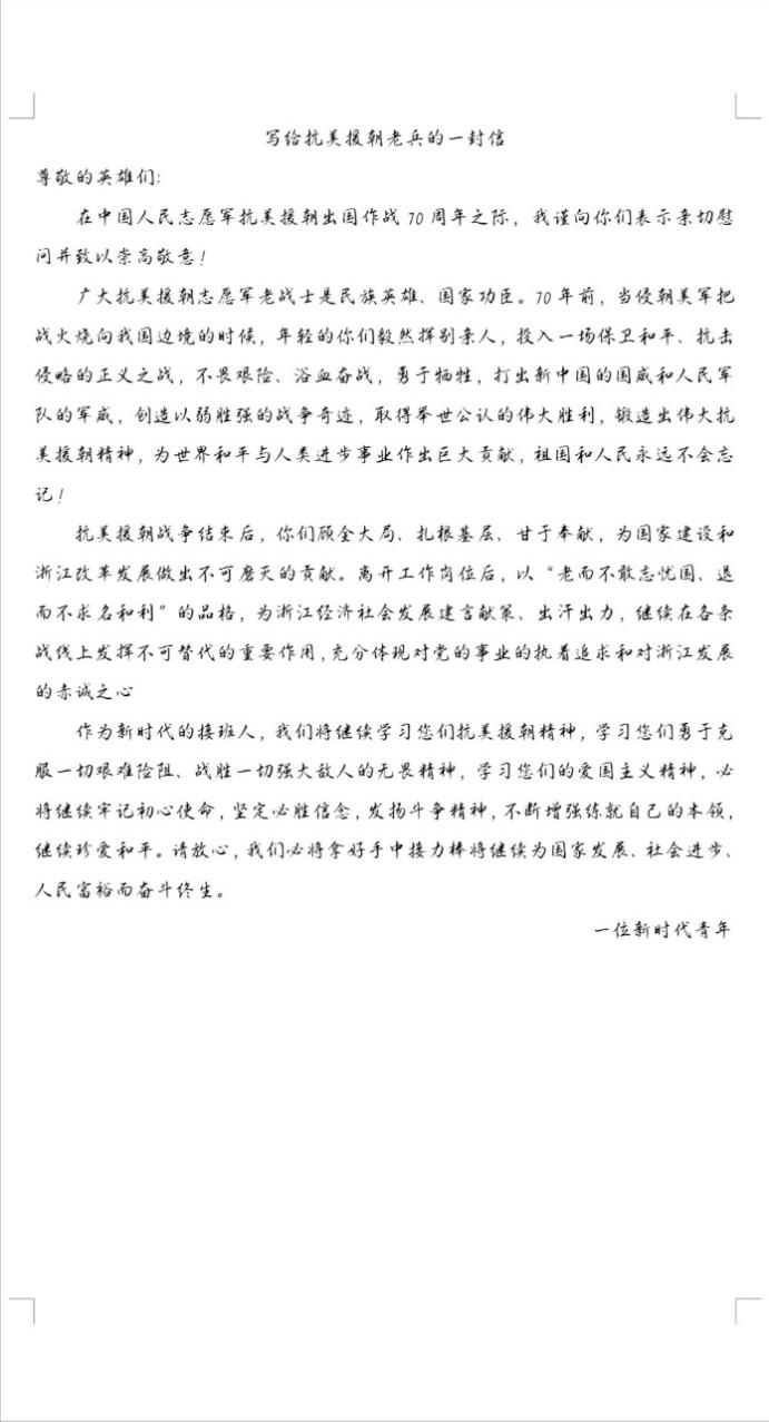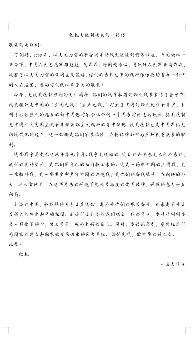 致敬英雄老兵,书信传心寄情:抗美援朝的老兵是我们国家的英雄,他们的付出换来了我们安定的生活环境,当年一位位身强体壮的年轻人如今也早已白了头,作为当代新青年的我们,必须牢记前辈们的付出。财管181班赵秀清和李甜甜同学以书信形式,文字随心,笔尖传情,动情的描述道:“这是一场新中国的立国战,是一场粉碎战,是一场用生命严守中国的边境战!是你们的奋战艰辛,在朝鲜的冬天,冰天雪地里,在这样恶劣的环境下凭借着高度的爱国精神,顽强的意志一直向前。”