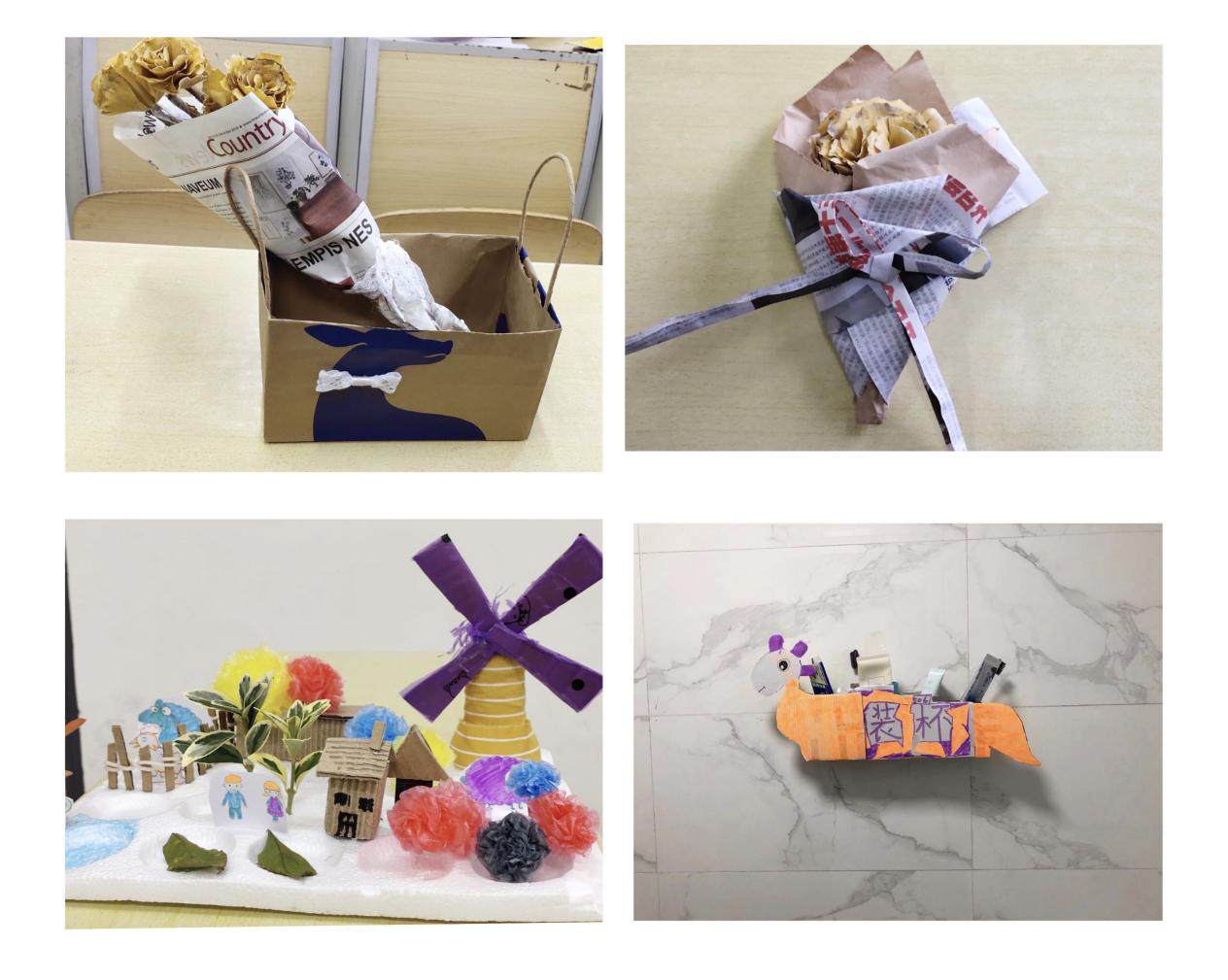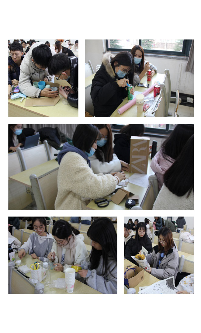 各个参赛队伍在有限的时间里,发挥无限的想象,以独特的审美视角,别样的创作理念,新颖的造型构思,对日常生活中的废品进行独具匠心的创意设计。其中“天线宝宝队”以团队合作的方式,充分利用快递盒、废纸、麻绳、蕾丝边、银杏叶等废旧物品,通过粘贴、拼接、改造,制作出了观景收纳盒,收纳宿舍零碎物品;“啥也不是队”利用纸箱、塑料瓶、树枝、树叶、旧衣服,在队员的认真裁剪、构思下,分工合理、配合默契地呈现出具有雕刻艺术的灯罩,又充分利用旧鞋盒制作美丽的相框和笔筒,将毫不起眼的泡沫板做成生动有趣的桌面装饰物,既将宿舍废品的利用价值最大化,也美化了宿舍环境。