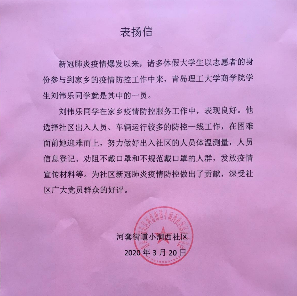 刘伟乐说“我们大学生要响应国家的号召,去到国家和群众需要的地方,能为社区的安全献出自己的一份绵薄之力,让我倍感荣幸。”执勤排查时,每当回答自己是青岛理工大学学生时都无比自豪,每当看到社区居民的笑容时最为感动。她耐心细致的工作态度得到社区群干的一致认可。