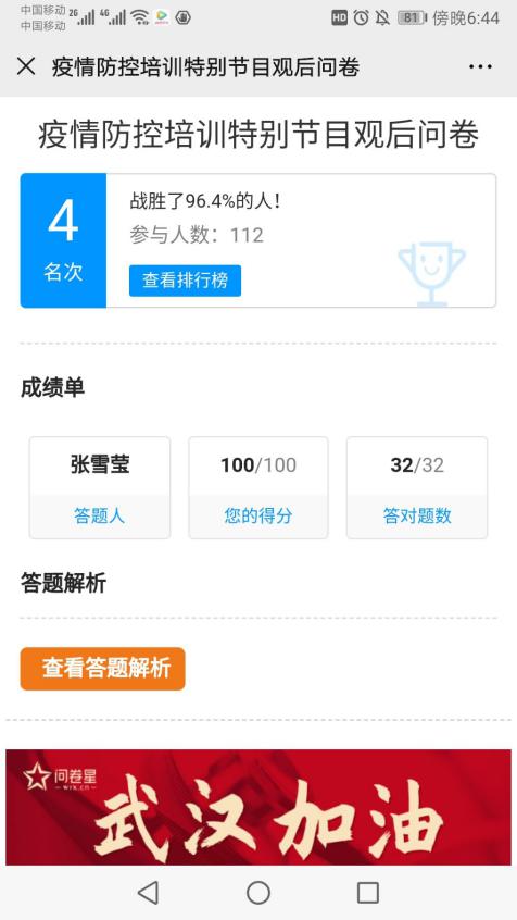 为了检验同学们对直播内容的掌握程度,保证学校日后工作的顺利开展,9999js金沙老品牌研究生会以问卷的方式对同学们进行了测试。问卷题目围绕着直播中老师们所讲述的重点知识进行展开,包括教室的消毒工作、宿舍的清洁和打扫问题以及个人餐饮和学校食堂应注意的问题。问卷结果以班级为单位进行整理,同学们积极参与,认真思考问题,全体研究生成绩均为优秀。