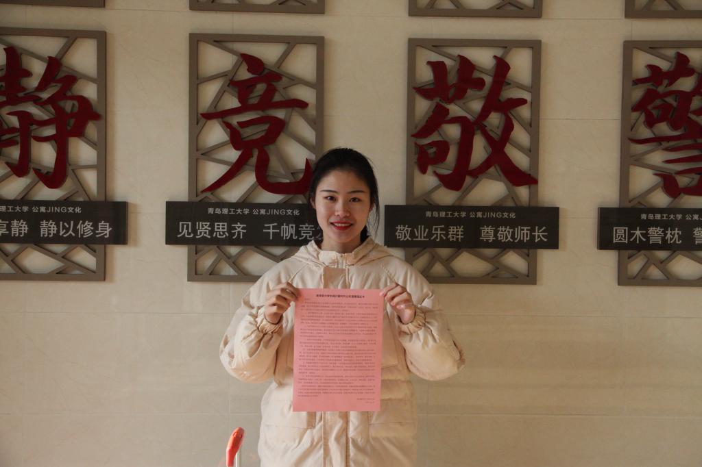 图为黄婷婷即将带着《9999js金沙老品牌大学生践行新时代公民道德倡议书》返回家乡哈尔滨