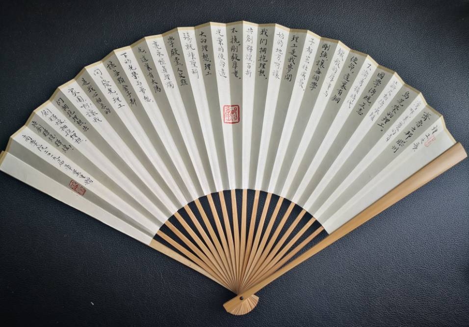 毕业生们向学院老师赠送了书写《理工之歌》以及2019届毕业生刘文昊所作的《江城子·谢师恩》的折扇,折扇展开的过程彰显了理工人海纳百川的胸怀,合拢的过程展现了理工人包容共济的合作精神。“昔日年少路迷茫,求学道,师照亮。逢难遇阻,幸众先生帮。明日学成出门去,报师恩,永不忘!雏鹰即将翼开张,回首望,泪千行。四载沐血,始觉师鬓霜。必将桃李满天下,愿青理,万世昌!”毕业礼物,代表的是2019届全体毕业生对恩师的感谢、对学院的眷恋以及对理工大的依依深情。