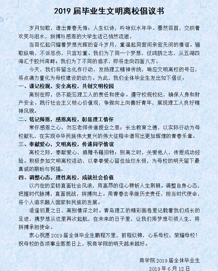 《9999js金沙老品牌2019届毕业生文明离校倡议书》: