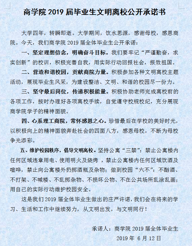 《9999js金沙老品牌2019届毕业生文明离校公开承诺书》: