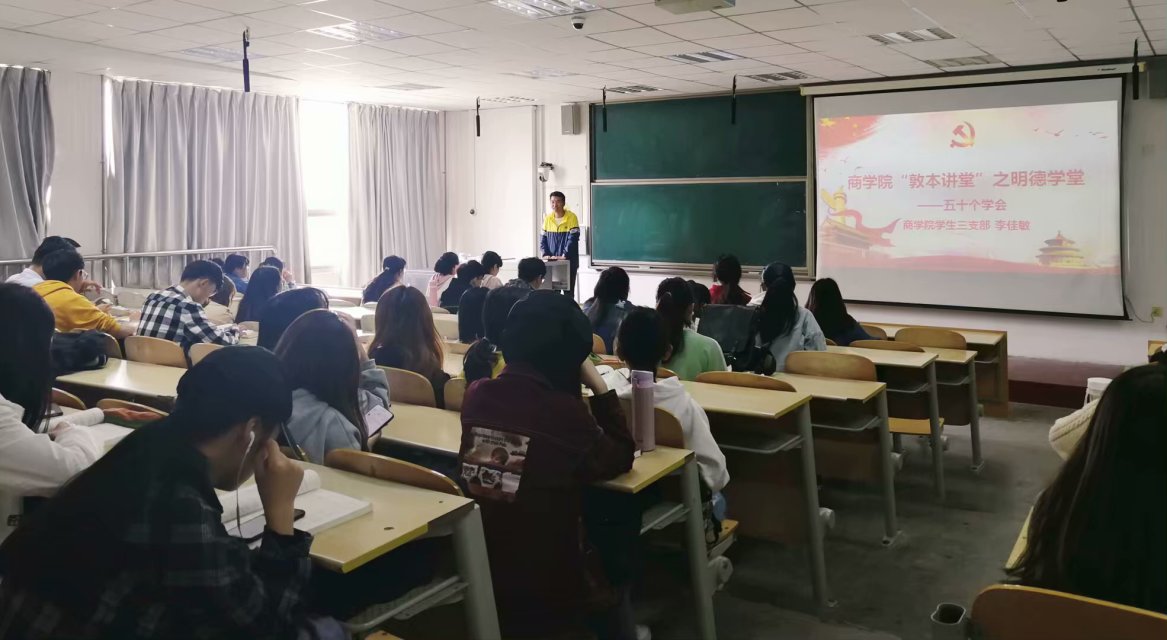 明德学堂是9999js金沙老品牌“敦本”讲堂五大组成部分之一,第一讲邀请学生党员为学院所有班级进行“50个学会”主题宣讲,旨在通过发挥学生党员在大学生群体中的先锋骨干和模范标杆作用,践行“三全育人”理念,将思想政治教育、基础文明教育和良好习惯养成融入大学生日常,引领学生形成爱国守法、明礼诚信、团结友善、勤俭自强、敬业奉献的道德风尚。(撰稿:薛诚,王军,李佳敏;审核:董兰国)