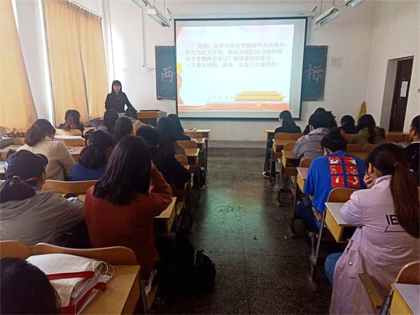 理论宣讲围绕什么是两会、2019年政府工作报告、2019年两会热点等方面学习了“两会”精神。就“科技创新”、“养老与教育”、“城乡居民的医食住行”、“打赢脱贫攻坚战”、“就业”等两会中提出的热点问题深入探讨。与会学生认真学习了习近平总书记在两会上的讲话精神,并展开热烈讨论,“作为学生干部,首先要积极学习。其次就是将两会精神运用到生活中去,在班级活动中,积极引导大家。”“在就业方面,我们应该关注相关专业企业的动态,对未来有更确切的打算。主动寻找实习机会,为以后工作积累经验。”同学们纷纷表示,作为新时代的学子,一定会在中国共产党的带领下,牢记使命,砥砺前行!