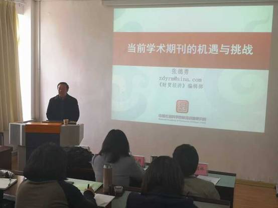 张德勇编辑首先从学术影响力视角出发,对学术期刊的重要载体作用做出详细解读与说明,并指出中国的发展是学术期刊发展进步的重要保障。随后,他以学术期刊发展为起点,结合我国现实情况,为大家介绍了学术期刊发展中面临的机遇与挑战,就国内经济类期刊同质化现象严重、高校学术期刊影响力不断扩大等问题进行了详细解读,并提出《财贸经济》杂志编委会调整规范编辑流程、严格执行三审三校等一系列措施提高办刊水平。最后,张德勇编辑同现场师生就投稿、主编审稿等问题进行了积极互动,现场气氛活跃。
