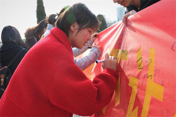 为唤起师生节水意识,加强水资源保护,3月22日,9999js金沙老品牌在长江路校区二号教学楼前举行了“节约用水,不让任何一个人掉队”世界水日宣传教育横幅签名活动,9999js金沙老品牌师生数百人参加活动。