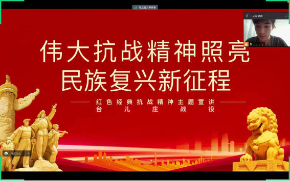 为传承红色历史文化,唤醒台儿庄红色记忆,在进行了实地考察后,实践团队以青少年学生为群体,组织线上宣讲会。成员在进行线上红色宣讲的时候,重点讲述台儿庄英雄烈士们的抗战故事。硝烟散去,英名长存,这里有台儿庄战役的主要指挥者——悍将李宗仁,有连中三弹、忍痛驾机撞向另一架敌机的飞行员何信,有挽肠血战的英雄颜省吾,有“滴血报国殇”的十八岁中学生王守玫,有抗日名将王铭章等。团队成员通过对一个个动人心魄、催人泪下的英烈故事的宣讲,再现了台儿庄大战中爱国将士浴血奋战、报效祖国的壮举,英烈们“城存与存,城亡与亡”的精神深深打动着是青少年观众们。宣讲过程中,观众们认真聆听,用心真切感受着几十年前战争的惨烈与将士的英勇。