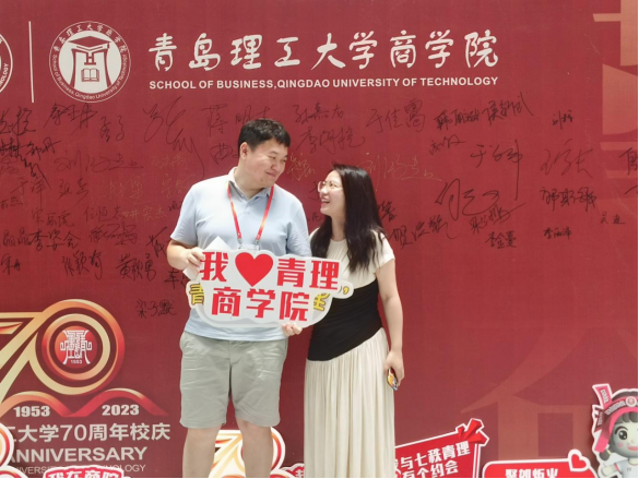 最后,校友们来到商院大楼一楼,佩戴校友卡,在学院准备的展板上签名,几代青理人手持“七秩青理,薪火相传”的横幅合影留念,理工精神、代代传承,再相逢,正青春。在青理商院的四年求学岁月虽短暂,却也在每一名校友的心中留下了不可磨灭的印记,是校友们终身难忘的宝贵回忆。